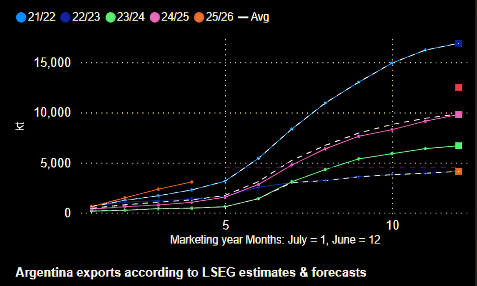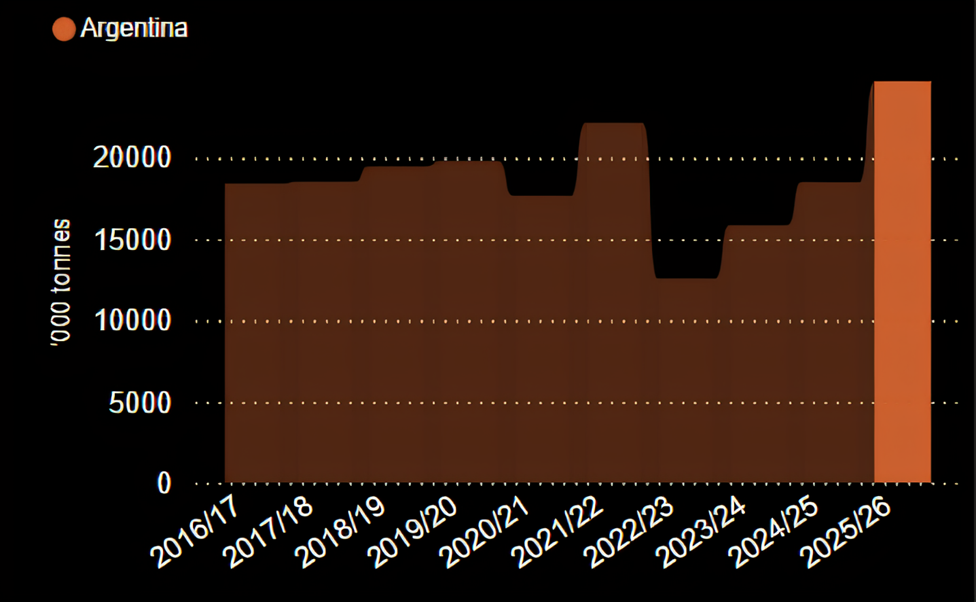Nền tảng cho sức mạnh cạnh tranh về giá và khối lượng xuất khẩu đột phá này chính là một vụ mùa bội thu lịch sử. Dự kiến, sản lượng thu hoạch toàn quốc sẽ đạt 27,7 triệu tấn, con số lớn nhất từng được ghi nhận trong lịch sử Argentina. Nguồn cung dồi dào này đã cho phép quốc gia này đẩy mạnh xuất khẩu ngay từ đầu mùa vụ, với tổng lượng hàng xuất đi chỉ trong tháng 12 đã đạt 2,48 triệu tấn, gần gấp đôi sản lượng vận chuyển trong cùng kỳ năm trước.