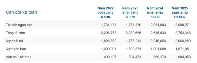 Tính đến cuối năm 2025, tổng tài sản của doanh nghiệp đạt khoảng 2.753 tỷ đồng, vốn chủ sở hữu gần 684 tỷ đồng, trong khi nợ phải trả ở mức khoảng 2.069 tỷ đồng. Chỉ số EPS đạt khoảng 5.609 đồng/cổ phiếu, tăng mạnh so với các năm trước đó.