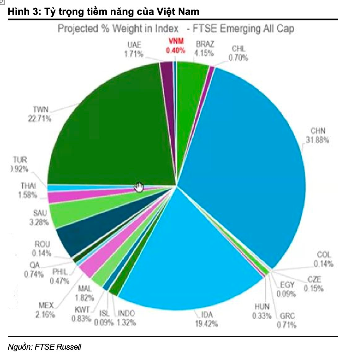 Dựa trên dữ liệu tại ngày 31/12/2024, FTSE Russell ước tính tỷ trọng của Việt Nam trong FTSE EM All Cap Index vào khoảng 0,4%, với 28 cổ phiếu đủ điều kiện được đưa vào rổ chỉ số. Dòng vốn thụ động tiềm năng được ước tính đạt 0,8–1 tỷ USD, trong khi dòng vốn chủ động có thể cao gấp tới năm lần.