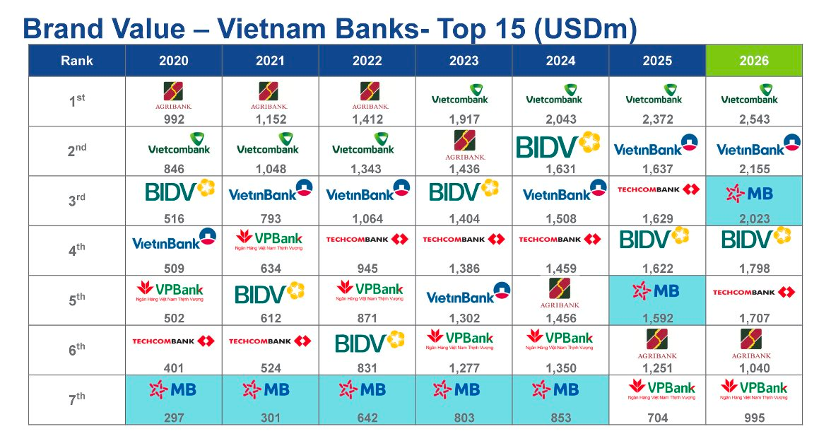 Giá trị thương hiệu đạt 2,023 tỷ USD, tăng 27% so với năm 2025, thuộc Top 3 thương hiệu ngân hàng giá trị nhất Việt Nam.
