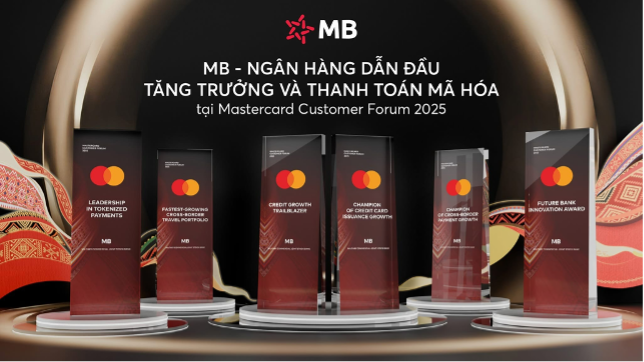 Theo đó, MB được vinh danh tại sáu hạng mục danh giá, bao gồm: Ngân hàng tiên phong về tăng trưởng thẻ tín dụng (Credit Growth Trailblazer); Ngân hàng dẫn đầu về tăng trưởng phát hành thẻ tín dụng (Champion of Credit Card Issuance Growth); Ngân hàng dẫn đầu về tăng trưởng chi tiêu quốc tế (Champion of Cross-Border Payment Growth); Ngân hàng có danh mục chi tiêu du lịch quốc tế tăng trưởng nhanh nhất (Fastest-Growing Cross-Border Travel Portfolio); Ngân hàng dẫn đầu về thanh toán mã hóa (Leadership in Tokenized Payments); Giải thưởng đổi mới sáng tạo ngân hàng tương lai (FutureBank Innovation Award) – Hạng mục vinh danh ngân hàng tiên phong giải pháp thanh toán mã hóa – Tài khoản chạm đầu tiên tại Việt Nam.