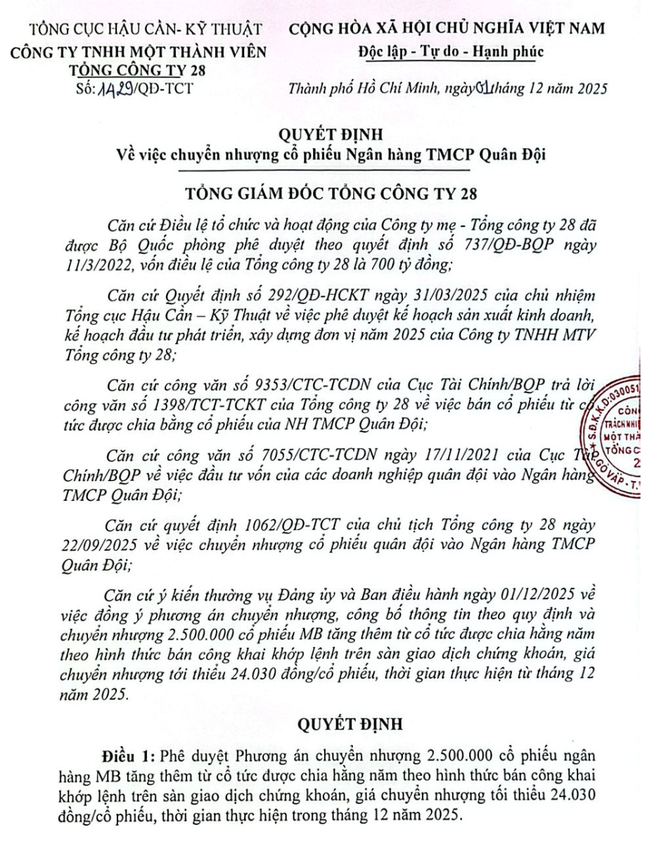 Giao dịch dự kiến thực hiện ngay trong tháng 12/2025 qua phương thức khớp lệnh trên sàn HOSE. Được biết, hiện tại Tổng Công ty 28 đang sở hữu hơn 38,2 triệu cổ phiếu MBB, tương đương 0,474% vốn điều lệ của ngân hàng này.