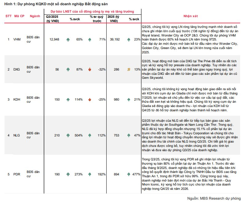 Với Vinhomes (VHM) , MBS dự báo lợi nhuận quý 3 đạt 12.948 tỷ đồng, tăng 65% so với cùng kỳ đến từ dự án Royal Island, Wonder City và OCP 2&3. MBS dự phóng VHM hoàn thành được 60% kế hoạch LN năm trong 9T25. Các đại dự án mới được mở bán kể từ đầu năm như Wonder City, Golden City, Green City, sẽ đem lại LN lớn trong nửa cuối năm 2025.