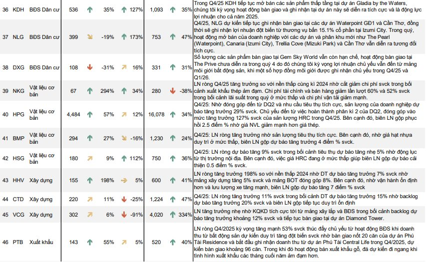 Cụ thể, hàng loạt cổ phiếu dự báo ghi nhận lợi nhuận "tăng bằng lần" trong quý 4/2025 gồm BSR, PDR, VRE, VHM, NKG, DCM, PC1, NT2, POW,... Ngược chiều, nhiều doanh nghiệp sẽ có lợi nhuận tăng trưởng âm trong quý này như ACB, STB, PVS, DBC, BCM, DXG, VTP....
