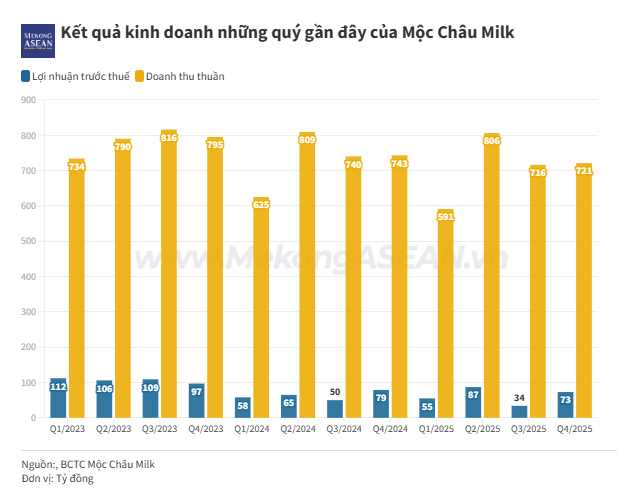 CTCP Giống bò sữa Mộc Châu (Mộc Châu Milk, mã: MCM) vừa công bố báo cáo tài chính quý 4/2025, ghi nhận doanh thu thuần đạt 721,2 tỷ đồng, giảm nhẹ 3% so với cùng kỳ năm ngoái (YoY).
