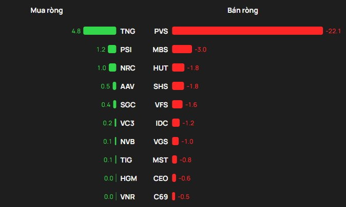 Ở chiều bán, PVS bị bán ròng mạnh nhất với khoảng 22 tỷ đồng, tiếp đến là MBS khoảng 3 tỷ đồng, HUT khoảng 1,8 tỷ đồng, SHS khoảng 1,8 tỷ đồng và VFS khoảng 1,6 tỷ đồng.