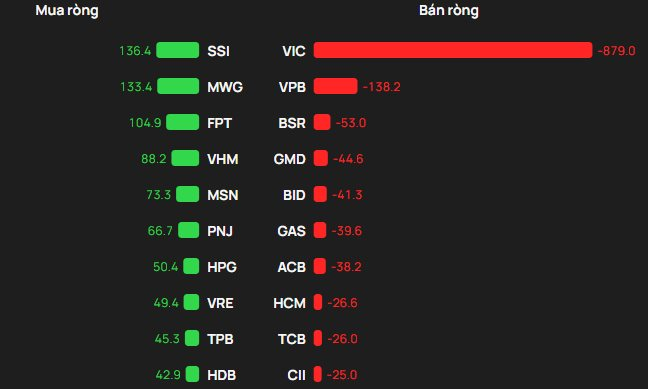 Ở chiều ngược lại, áp lực bán ròng tập trung mạnh nhất tại VIC với giá trị xấp xỉ 879 tỷ đồng. Các mã tiếp theo bị bán ròng mạnh gồm VPB khoảng 138 tỷ đồng, BSR khoảng 53 tỷ đồng, CMD khoảng 45 tỷ đồng và BID khoảng 41 tỷ đồng.