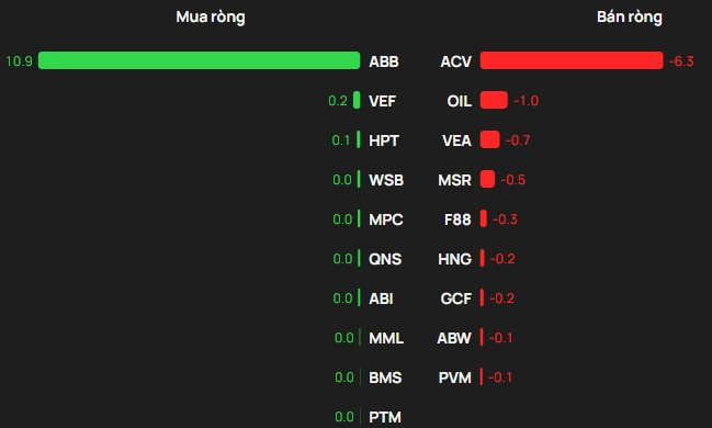 Ở chiều ngược lại, ACV bị bán ròng mạnh nhất với khoảng 6 tỷ đồng, tiếp theo là OIL khoảng 1 tỷ đồng, VEA khoảng 0,7 tỷ đồng, MSR khoảng 0,5 tỷ đồng và F88 khoảng 0,3 tỷ đồng.
