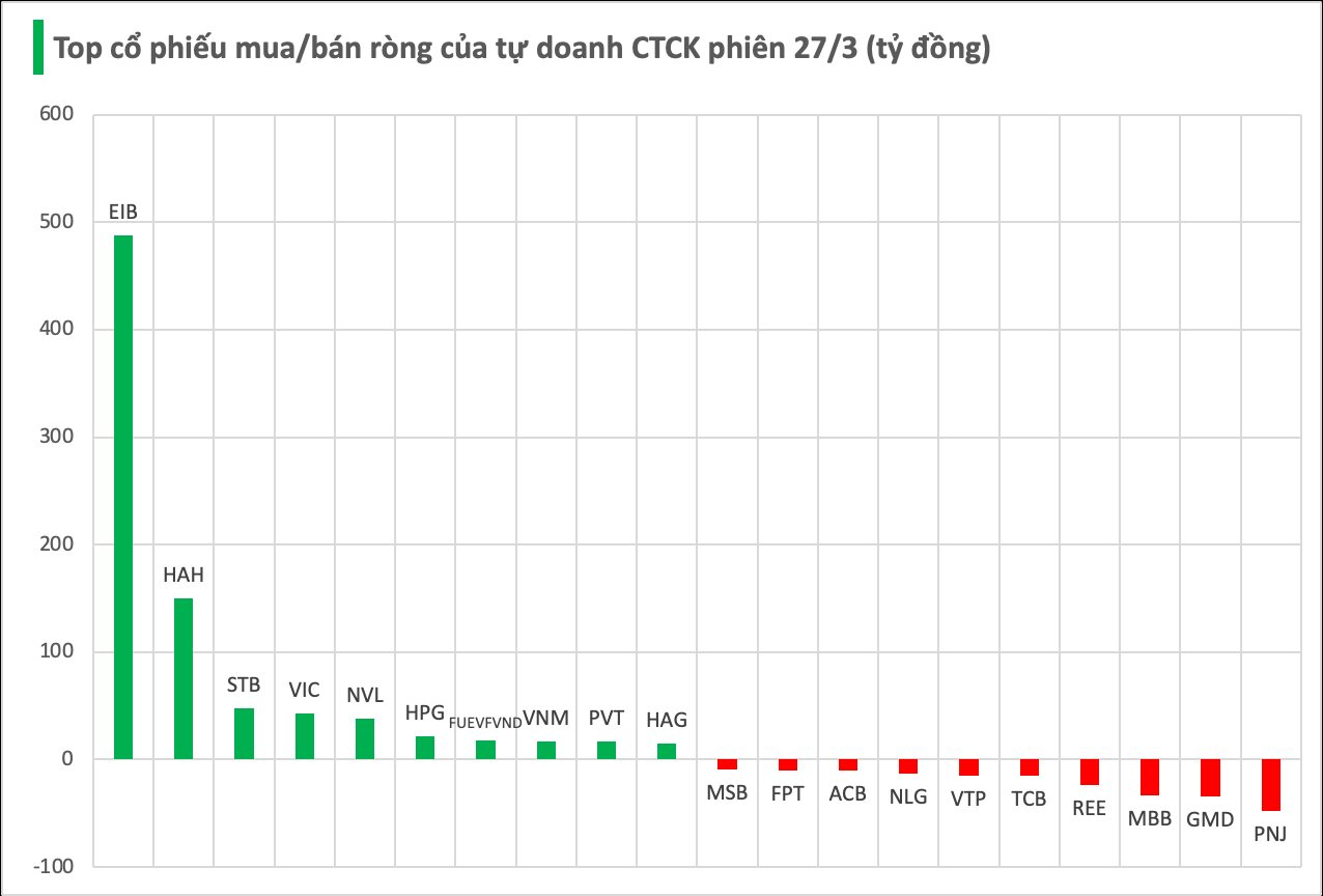 Cụ thể, EIB và HAH được mua ròng với giá trị lần lượt là 488 tỷ và 150 tỷ đồng. Theo sau là STB (48 tỷ), VIC (43 tỷ), NVL (38 tỷ), HPG (22 tỷ), FUEVFVND (17 tỷ), VNM (17 tỷ), PVT (17 tỷ) và HAG (15 tỷ đồng) đều được tự doanh CTCK mua mạnh.