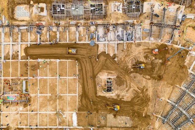 Hiện dự án đang bước vào giai đoạn thi công nền móng. Công tác xử lý nền đất, điều chỉnh cao độ và triển khai các cụm móng, cọc bê tông được thực hiện song song, đảm bảo các yêu cầu kỹ thuật cho kết cấu chịu lực. Trên công trường, hàng trăm công nhân cùng hệ thống máy móc chuyên dụng hoạt động liên tục, góp phần đẩy nhanh tiến độ san nền và thi công móng.