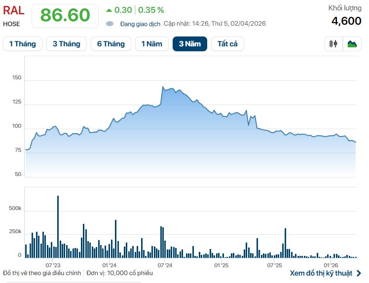 Trên thị trường, cổ phiếu RAL hiện đang "dò đáy" 3 năm quanh vùng 86.600 đồng/cp, tương đương giảm khoảng 7% so với đầu năm.