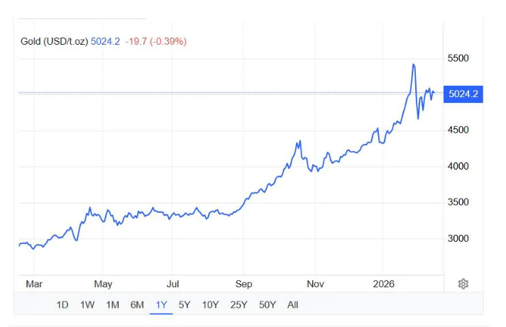 Ngày 29/1, giá vàng lên đến gần 5.454 USD/ounce, mức kỷ lục trong lịch sử, cho thấy tài sản kim loại quý được săn đón khi các nguồn lực hữu hình trở nên khan hiếm hơn. Ngày 16/2, giá vàng vẫn ở mức hơn 5.000 USD/ounce, tăng hơn 70% so với cùng kỳ năm ngoái.