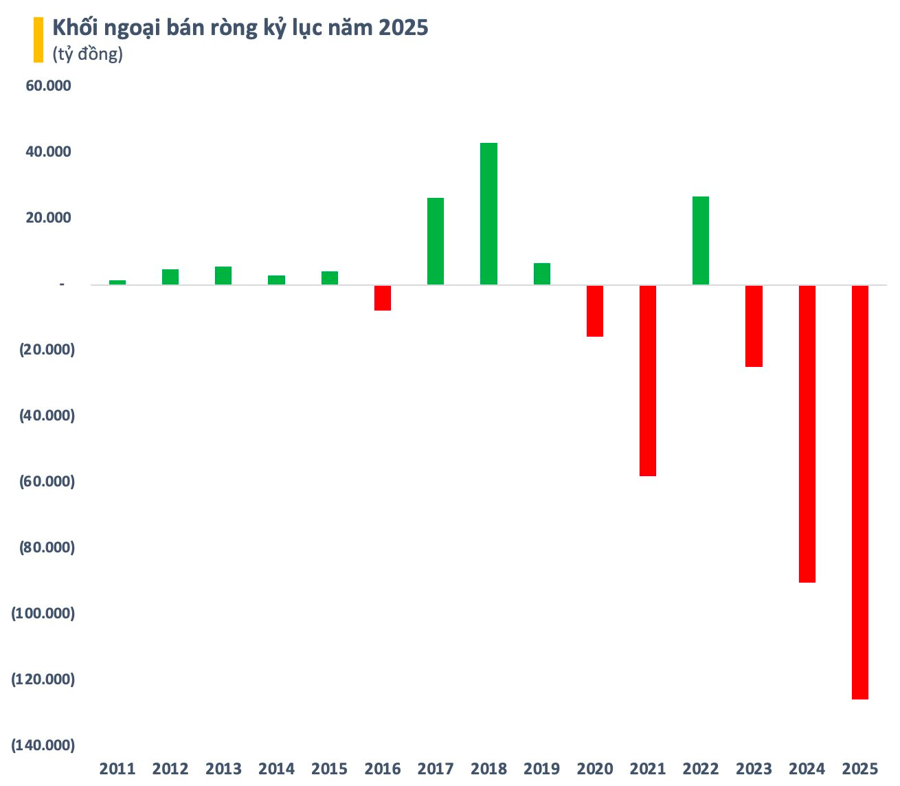 Những năm qua, việc thiếu hàng hoá mới, chất lượng là một trong những nguyên nhân khiến nhà đầu tư nước ngoài không mấy mặn mà với chứng khoán Việt Nam. Riêng trong năm 2025, khối ngoại đã bán ròng kỷ lục hơn 125.000 tỷ đồng trên HoSE. Trong các đợt cao điểm, khối ngoại rút ròng hàng nghìn tỷ mỗi phiên.