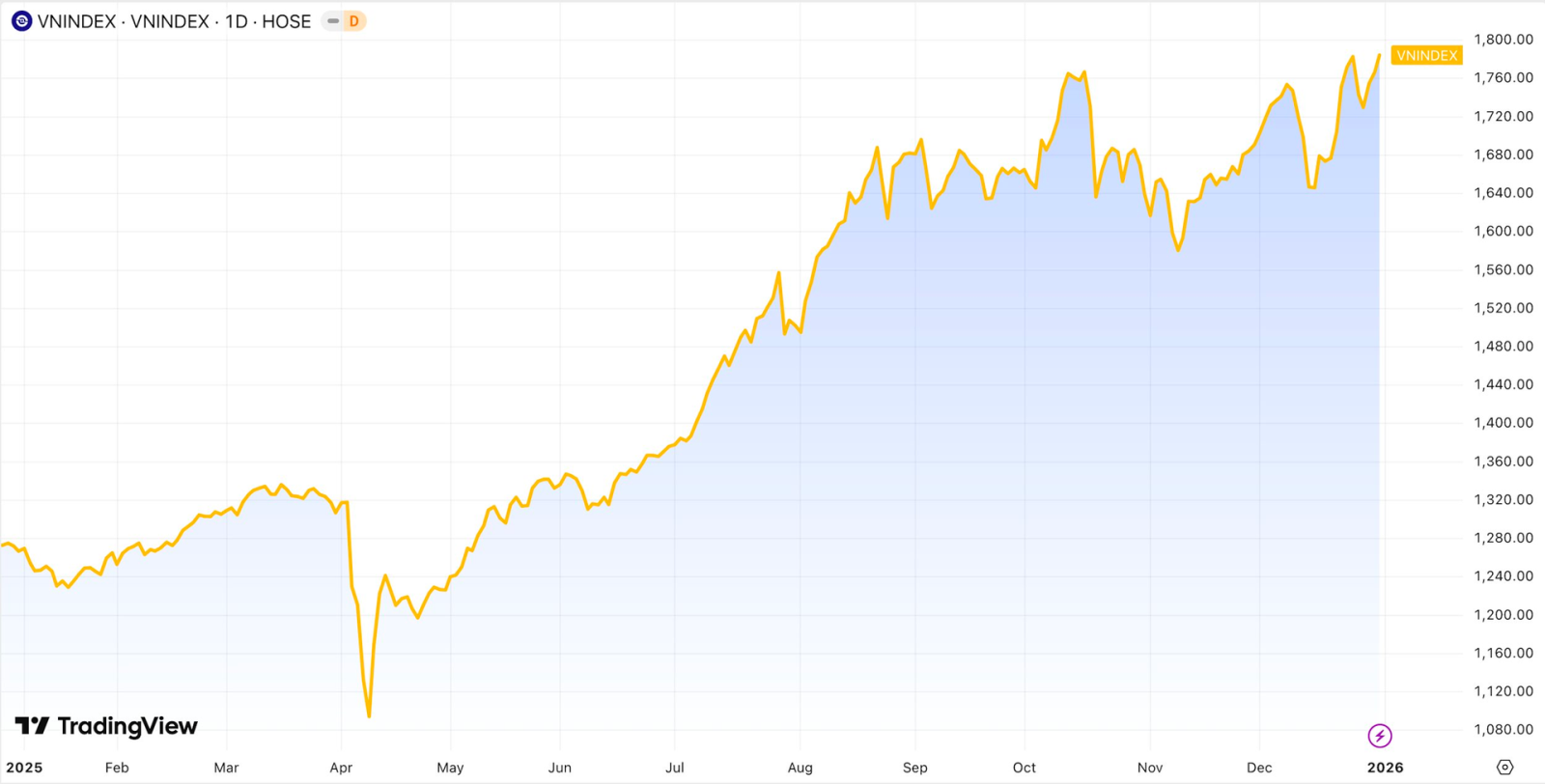 Thực tế, VN-Index đã tiến gần đến vùng 1.800 điểm từ giữa tháng 10 nhưng áp lực chốt lời liên tục kìm hãm đà tăng của thị trường. Phải đến những ngày cuối năm 2025, nhà đầu tư chứng khoán mới thực sự có lần đầu thấy mốc 1.800 điểm dù chỉ rất ngắn ngủi. Kết thúc năm, VN-Index đóng cửa cao nhất lịch sử 1.784,49 điểm, tăng hơn 40% so với đầu năm.