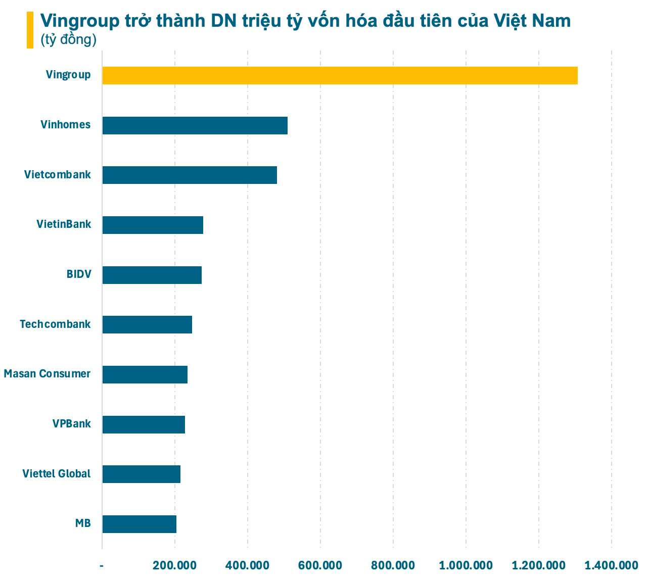 Trên còn đường VN-Index đi lên 1.800 điểm trong năm qua không thể không nhắc đến dấu ấn của Vingroup (VIC). Tập đoàn của tỷ phú Phạm Nhật Vượng có một năm bứt phá ngoạn mục, cổ phiếu tăng gấp 8 lần, vốn hóa lên đến hơn 1,3 triệu tỷ đồng. Kỷ lục vô tiền khoáng hậu đưa Vingroup trở thành doanh nghiệp đầu tiên của Việt Nam có mức vốn hóa vượt ngưỡng 1 triệu tỷ đồng.