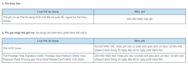 Khách hàng thay thẻ ghi nợ, thẻ tín dụng ACB đều có phí 200 nghìn đồng/thẻ/lần, ngoại trừ thẻ Visa Infinite.