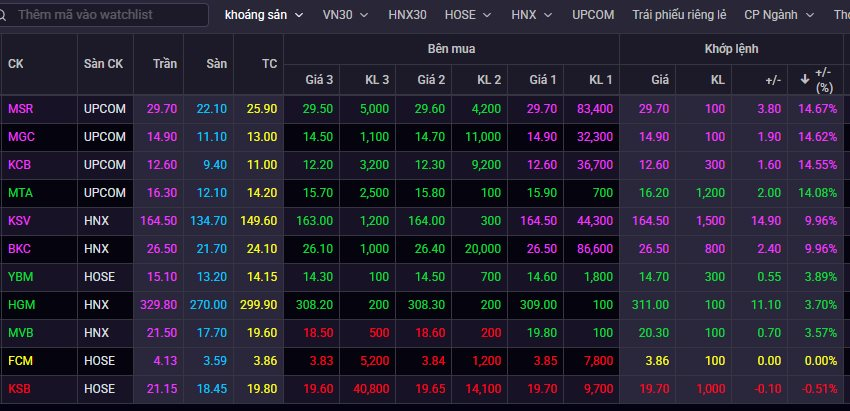 Không nằm ngoài "cuộc vui", nhóm cổ phiếu khoáng sản cũng bất ngờ dậy sóng. Hàng loạt cổ phiếu đua nhau tăng kịch trần phải kể tới Khoáng sản Bắc Kạn (mã: BKC), Khoáng sản và luyện kim Cao Bằng (mã: KCB), Khoáng sản TKV (Vimico – mã: KSV), Masan High-Tech Materials (mã MSR),...