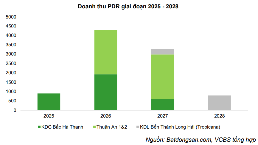 Theo VCBS, doanh thu năm 2025 của PDR tiếp tục được hỗ trợ đáng kể từ tiến độ bàn giao tại dự án Bắc Hà Thanh (Bình Định). Ước tính đến cuối quý III/2025, doanh nghiệp đã bàn giao gần 500 lô đất nền, phần còn lại sẽ được tiếp tục bàn giao từ nay đến giữa năm 2026.