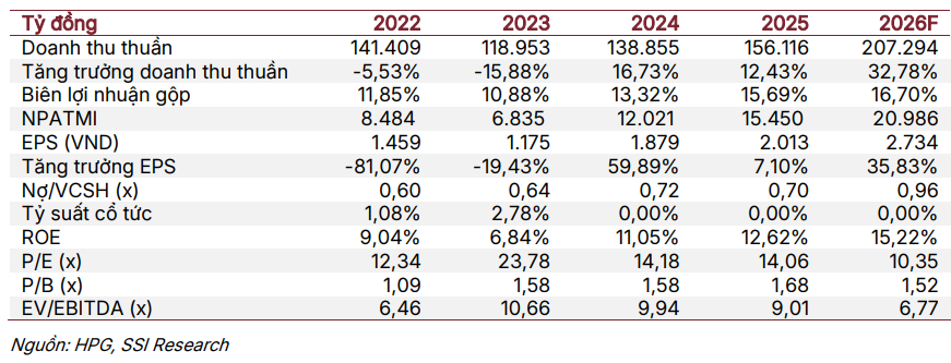Trên cơ sở các giả định điều chỉnh, SSI ước tính doanh thu thuần năm 2026 của HPG đạt khoảng 207.000 tỷ đồng, tăng 33% so với năm trước, dù thấp hơn mức dự báo 216.000 tỷ đồng trước đó. Biên lợi nhuận gộp được kỳ vọng cải thiện nhẹ, dưới 1 điểm phần trăm, nhờ tỷ lệ vận hành công suất cao hơn và giả định giá bán bình quân tăng. Lợi nhuận sau thuế năm 2026 được điều chỉnh giảm nhẹ xuống khoảng 21.000 tỷ đồng, song vẫn tăng 35% so với cùng kỳ năm trước.