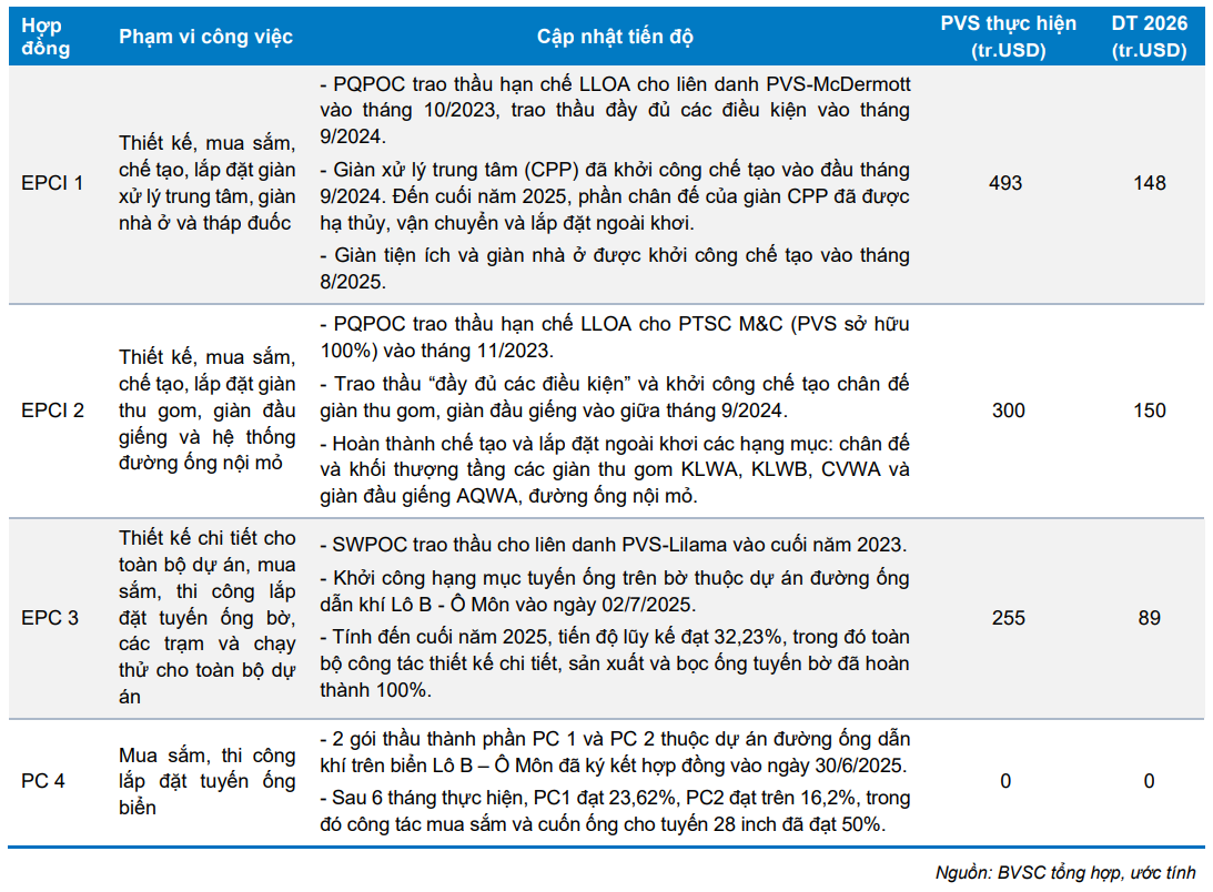 Một số dự án khác như Khánh Mỹ - Đầm Dơi và Nam Du - U Minh được kỳ vọng trao thầu trong năm 2026 để kịp tiến độ dòng dầu khí đầu tiên vào năm 2027. Với vị thế và năng lực đã được chứng minh, BVSC đánh giá PVS có nhiều cơ hội trúng thầu. Bên cạnh đó, các dự án năng lượng tái tạo và xây dựng công nghiệp tiếp tục được duy trì triển khai.