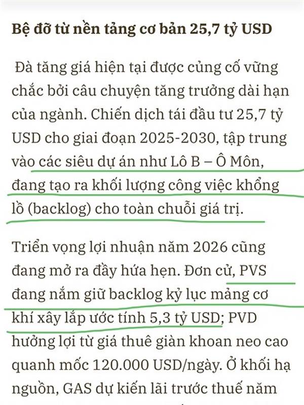 BVSC kỳ vọng động lực tăng trưởng chính của PVS đến từ khối lượng công việc dồi dào trong mảng xây lắp dầu khí trong nước. Năm 2026, PVS sẽ triển khai đồng loạt các dự án đã trúng thầu như Lô B - Ô Môn, Lạc Đà Vàng và Sư Tử Trắng 2B.