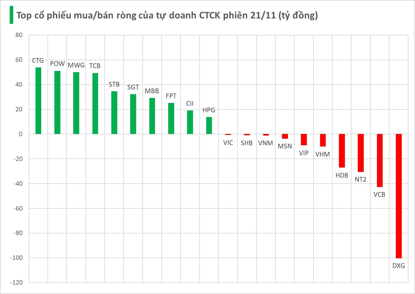 Chiều ngược lại, nhóm CTCK bán ròng mạnh nhất tại DXG với giá trị -100 tỷ đồng, tiếp theo là VCB (-43 tỷ), NT2 (-31 tỷ), HDB (-27 tỷ) và VHM (-10 tỷ đồng). Một số cổ phiếu khác cũng ghi nhận lực bán ròng đáng kể như VIP (-9 tỷ), MSN (-4 tỷ), VNM (-1 tỷ), SHB (-1 tỷ) và VIC (-1 tỷ đồng).