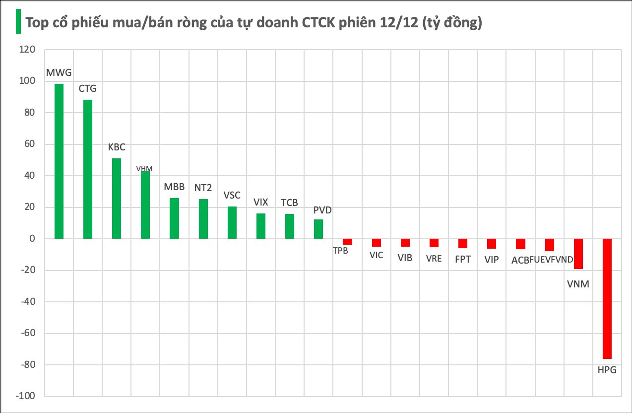 Cụ thể, MWG được mua ròng mạnh nhất với giá trị 99 tỷ đồng, theo sau là CTG (88 tỷ), KBC (51 tỷ), VHM (43 tỷ), MBB (26 tỷ), NT2 (25 tỷ), VSC (21 tỷ), VIX (16 tỷ), TCB (16 tỷ) và PVD (12 tỷ đồng) – đều nằm trong nhóm được tự doanh CTCK mua ròng tích cực.