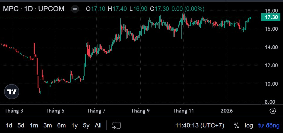 Trên thị trường chứng khoán, giá cổ phiếu MPC đã tăng từ vùng 10.000 đồng trong tháng 5/2025 lên 17.000 đồng vào đầu tháng 2/2026. Chốt phiên 6/2, cổ phiếu MPC đạt 17.300 đồng/cp, tăng 1,17% so với phiên trước, đưa vốn hóa của doanh nghiệp đạt 6.938 tỷ đồng.