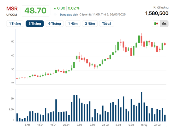 Với những tín hiệu khả quả từ kết quả kinh doanh năm 2025 cùng triển vọng giá sản phẩm ở mức cao, cổ phiếu MSR đã tăng gấp đôi từ đầu năm 2026 đến nay, hiện dao động ở mức quanh 49.000 đồng/cp, tương ứng vốn hóa đạt gần 53.500 tỷ đồng (gần 2 tỷ USD).