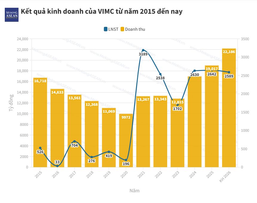 Năm vừa qua, VIMC ghi nhận gần 19.017 tỷ đồng doanh thu thuần hợp nhất, tăng 12% so với năm 2024; lợi nhuận gộp đạt 3.474 tỷ đồng, tăng 23,5% YoY.