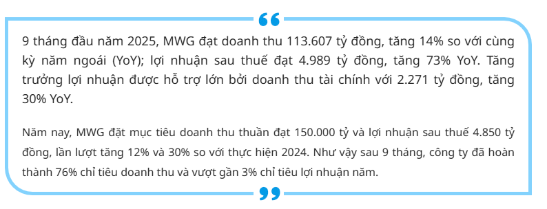 Ngành hàng điện máy cũng tích cực khi Điện máy Xanh tăng trưởng hai con số dù số lượng cửa hàng không đổi (doanh thu 9 tháng đầu năm tăng khoảng 16% so với cùng kỳ). Theo giải thích của ông Linh, điều này là nhờ xu hướng chuyển dịch của người tiêu dùng sang kênh mua sắm hiện đại trong khi MWG có thị phần lớn, cùng với đó là việc đẩy mạnh dịch vụ, tạo ra các thị trường mới cho sản phẩm... Sang năm 2026, lãnh đạo MWG vẫn lạc quan với triển vọng của mảng điện máy và kỳ vọng Điện máy Xanh tiếp tục tăng trưởng hai con số.