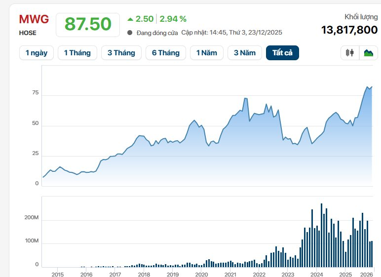 Việc cổ phiếu MWG lập đỉnh lịch sử không chỉ phản ánh sự hưng phấn ngắn hạn của dòng tiền, mà còn cho thấy kỳ vọng dài hơi vào chu kỳ phục hồi của ngành bán lẻ. Khi sức mua dần cải thiện, lợi thế về quy mô, độ phủ và năng lực quản trị chuỗi giúp Thế Giới Di Động được đánh giá là một trong những doanh nghiệp hưởng lợi rõ nét nhất.