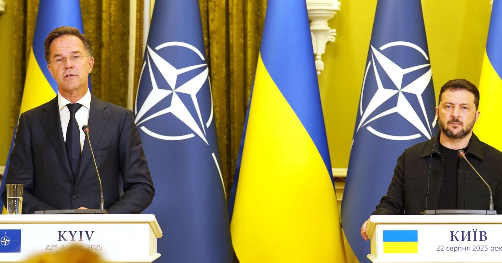 Tổng thống Ukraine Volodymyr Zelensky, phải, và Tổng Thư ký NATO Mark Rutte trong cuộc họp báo tại Kiev, ngày 22/8/2025. Ảnh: Kyodo/TTXVN