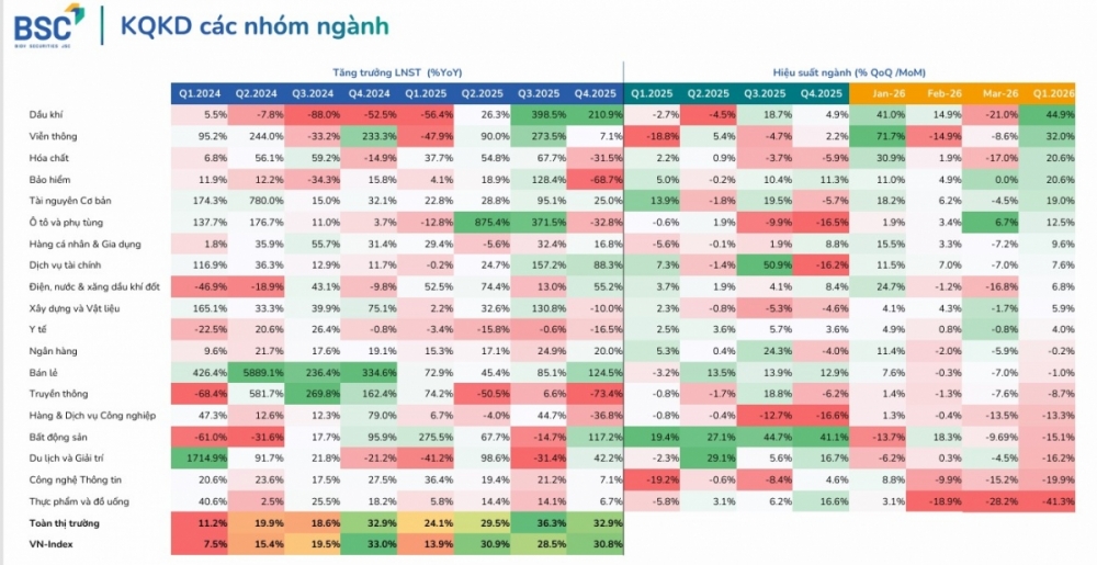Ở góc độ nền tảng, kết quả kinh doanh quý I/2026 tiếp tục là yếu tố củng cố xu hướng phân hóa. Những nhóm ngành có nền lợi nhuận ổn định hơn duy trì khả năng thu hút dòng tiền, trong khi các nhóm còn lại chưa tạo được lực hấp dẫn tương tự. Theo quan sát của BSC Research, sự phân hóa lợi nhuận giữa các ngành vẫn là yếu tố chi phối đáng kể đến cách dòng tiền vận động trong giai đoạn hiện tại.
