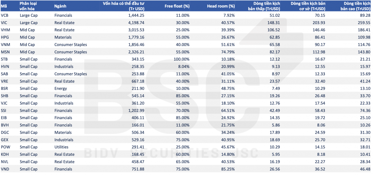 Theo tính toán sơ bộ của Chứng khoán BIDV (BSC), gần 20 mã có thể được các quỹ ETF toàn cầu thêm vào danh mục, trong đó nhiều đại diện đầu ngành như VIC, VHM, VCB, VNM và HPG được dự báo thu hút dòng vốn mạnh ngay khi lộ trình tái cơ cấu bắt đầu.