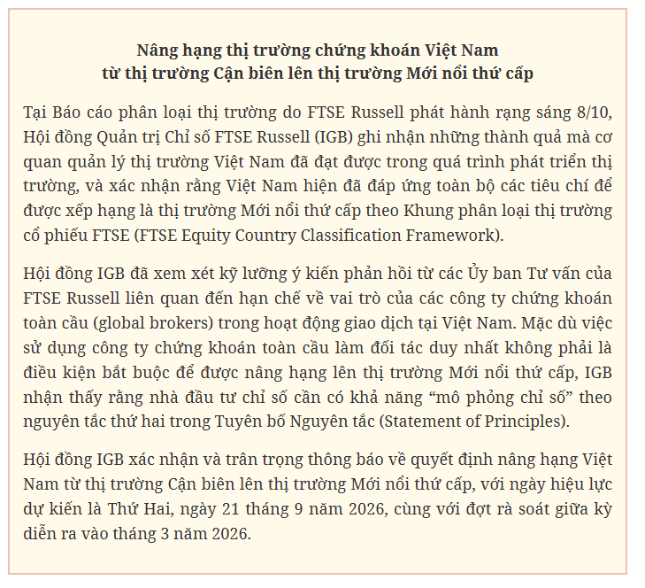 Rạng sáng ngày 8/10/2025 (vào lúc 03 giờ 00 phút theo giờ Hà Nội), tổ chức xếp hạng thị trường FTSE Russell công bố thị trường chứng khoán Việt Nam đã đáp ứng toàn bộ các tiêu chí chính thức và được nâng hạng từ thị trường cận biên lên thị trường mới nổi thứ cấp.