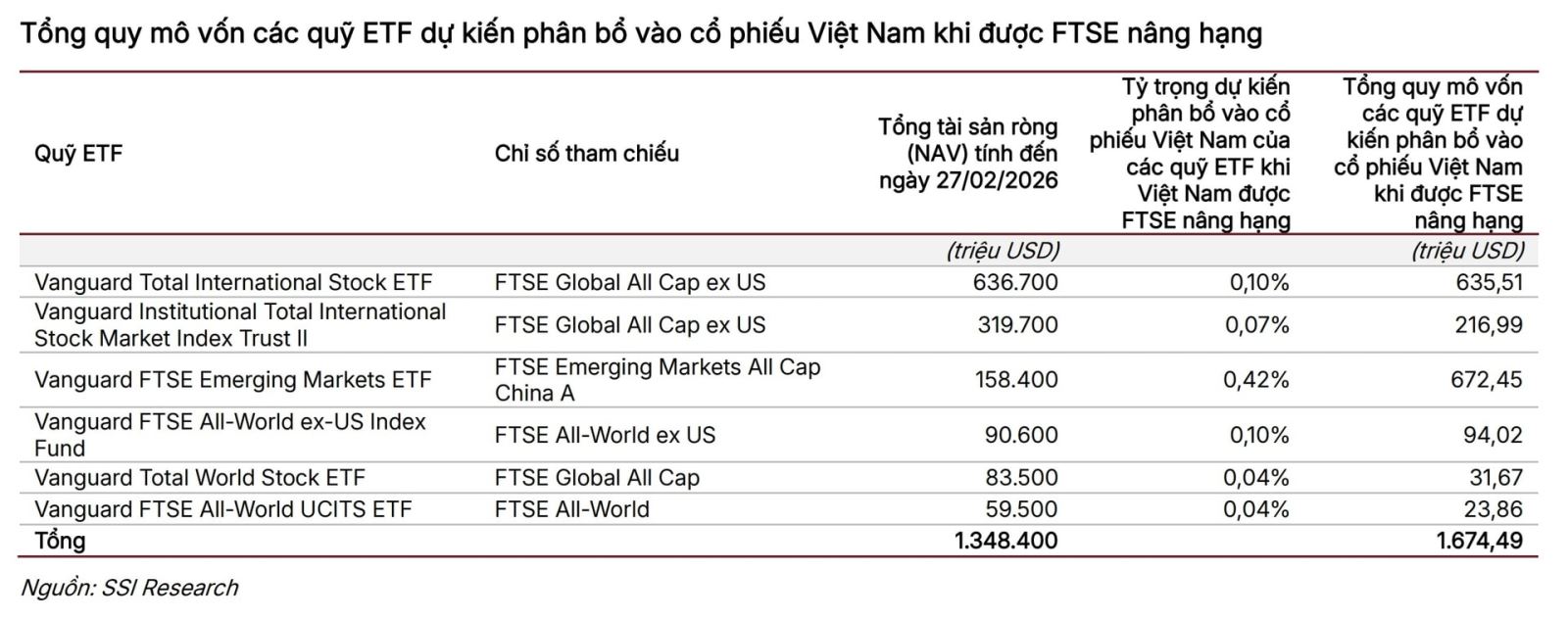 Tổng quy mô vốn của các quỹ ETF dự kiến sẽ phân bổ vào thị trường cổ phiếu Việt Nam được kỳ vọng gia tăng đáng kể khi Việt Nam được FTSE nâng hạng, qua đó tạo động lực thu hút dòng vốn ngoại và cải thiện thanh khoản cho thị trường. Cụ thể, con số cập nhật tổng vốn các quỹ giải ngân lần đầu theo ước tính của SSI Research sẽ khoảng gần 1,674 tỷ USD (xấp xỉ 1,7 tỷ USD).