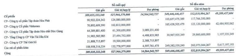 Trong đó, khoản đầu tư vào cổ phiếu VHM đang ghi nhận mức sinh lời cao nhất, tạm lãi khoảng 131% so với giá gốc. Khoản đầu tư vào HPG cũng đang tạm lãi khoảng 36%.