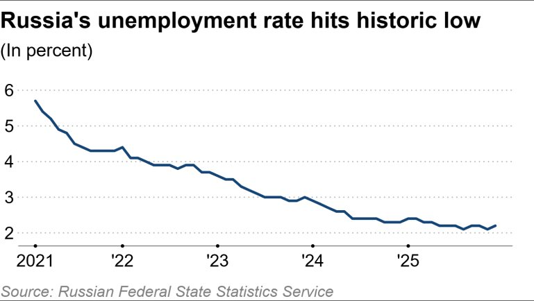 Nga đang phải đối mặt với tình trạng thiếu hụt lao động nghiêm trọng. Tỷ lệ thất nghiệp của Nga đã giảm từ hơn 4% trước cuộc xung đột Ukraine xuống mức thấp kỷ lục 2,2% khi quân đội điều động thêm lính tham gia chiến sự.