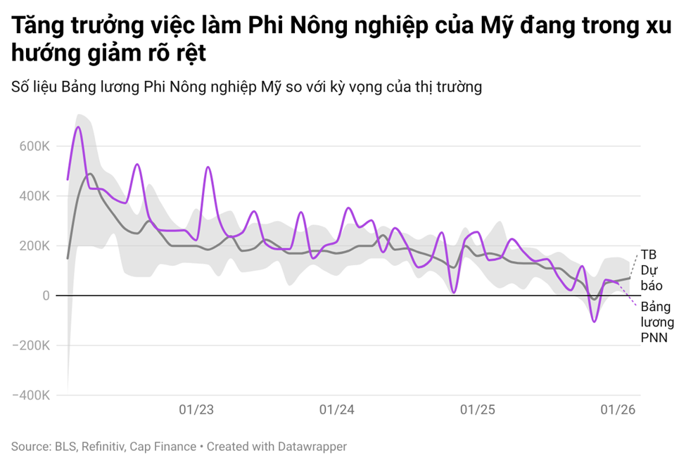Các ước tính sơ bộ cho thấy mức điều chỉnh có thể giảm đi tới hàng trăm ngàn việc làm so với những gì đã báo cáo trong năm 2025. Nếu mức điều chỉnh giảm này thực sự lớn, nó sẽ làm thay đổi hoàn toàn niềm tin của nhà đầu tư về sức mạnh thực sự của nền kinh tế Mỹ trong giai đoạn trước, đồng thời khẳng định rằng sự nguội lạnh của thị trường lao động đã diễn ra từ lâu và sâu sắc hơn những gì người ta hằng tưởng. Điều này đặt Fed vào một thế khó khi họ phải đối mặt với thực tế là chính sách thắt chặt tiền tệ có thể đã tác động tiêu cực đến nền kinh tế mạnh hơn dự kiến ban đầu.