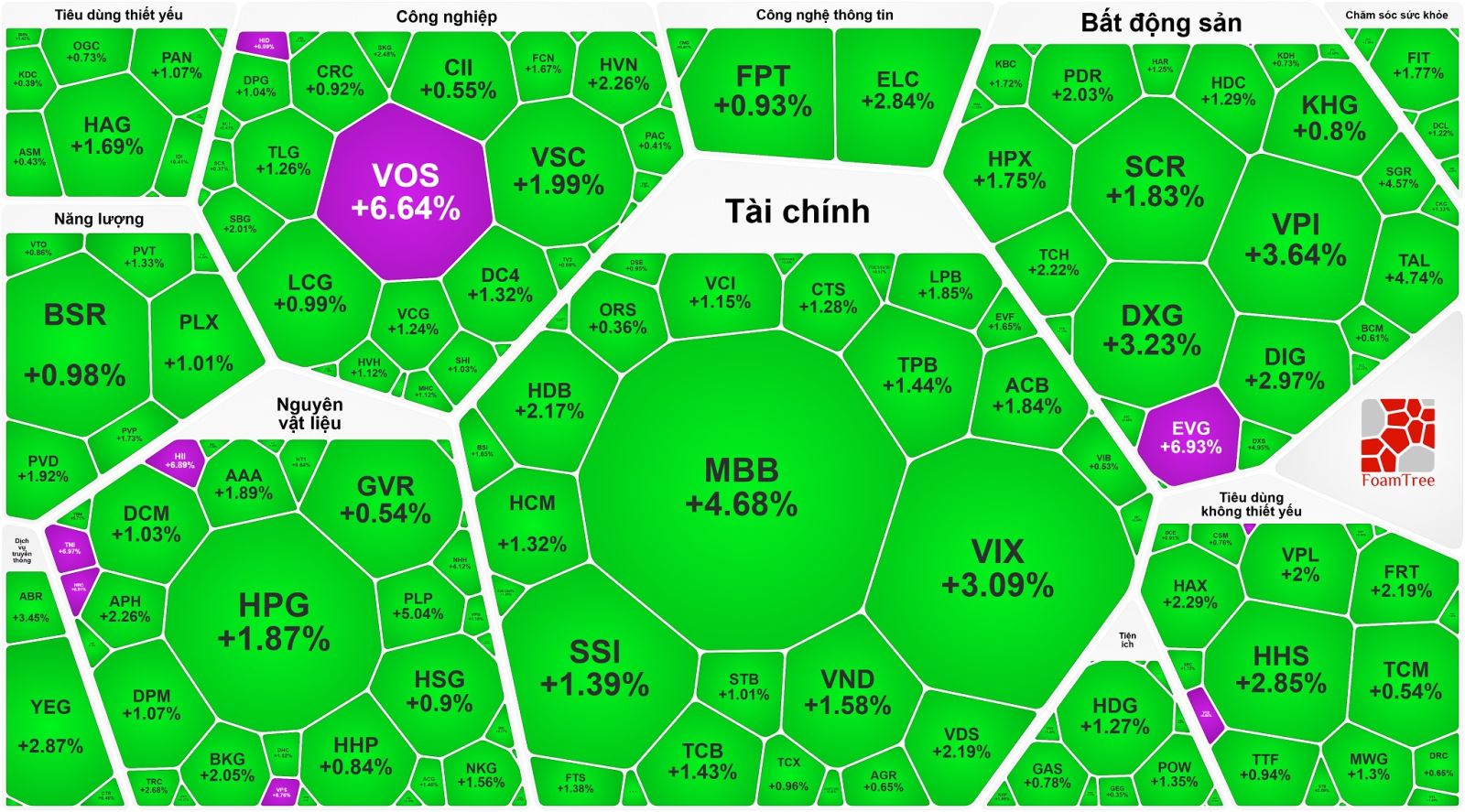 Tương tự là nhóm bất động sản. Bất chấp hai ông lớn VIC và VHM điều chỉnh, toàn ngành đồng loạt khởi sắc với nhiều đại diện đáng chú ý như TAL (4,7%), DXS (5%), VPI (3,6%), DXG (3,2%), DIG (3%), TCH (2,2%), PDR (2%), IDC (1,8%), KBC (1,7%), CEO (1,5%).