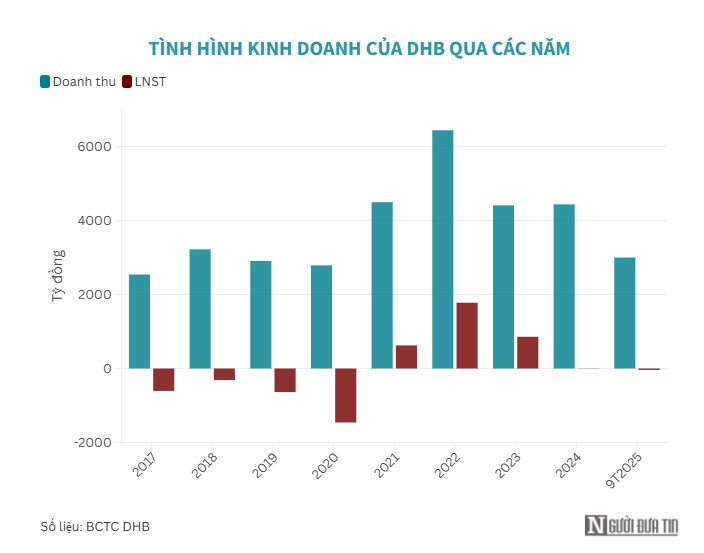 Lũy kế 9 tháng đầu năm 2025, doanh thu thuần của DHB đạt gần 3.000 tỷ đồng, gần như đi ngang so với cùng kỳ. Từ mức có lãi sau 6 tháng, công ty chuyển sang lỗ sau thuế 38 tỷ đồng tính đến cuối quý III, nhưng mức lỗ này vẫn thấp hơn khoản lỗ 61 tỷ đồng của cùng kỳ năm 2024. Công ty hiện ghi nhận lỗ lũy kế gần 2.142 tỷ đồng.