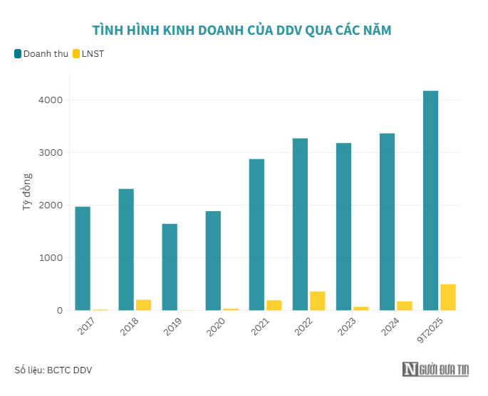 Nhờ cú bứt phá trong quý III, bức tranh 9 tháng đầu năm 2025 của DDV trở nên rực rỡ. Doanh thu thuần đạt 4.175 tỷ đồng, tăng 68% so với cùng kỳ, trong khi lợi nhuận sau thuế đạt 496 tỷ đồng, gấp 4,5 lần so với năm 2024. Doanh nghiệp đã vượt 25% kế hoạch doanh thu và tới 188% mục tiêu lợi nhuận trước thuế cả năm 2025 mà ĐHĐCĐ đề ra.