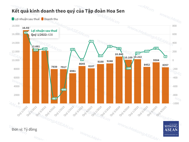 Hoa Sen ghi nhận doanh thu quý 4 năm tài chính 2024 - 2025 (từ 1/10/2024 - 30/9/2025) đạt 8.357 tỷ đồng, giảm 17% YoY và thấp nhất trong 8 quý gần đây. Biên lợi nhuận gộp cải thiện mạnh từ mức 8,4% lên 12,2%, giúp lợi nhuận gộp đạt 1.021 tỷ đồng, tăng 20% YoY.