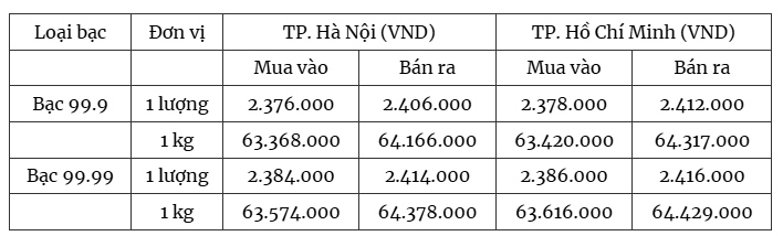 Giá bạc hôm nay tại Tập đoàn Vàng bạc Đá quý Phú Quý, giá bạc niêm yết ở mức 2.738.000 đồng/lượng (mua vào) và 2.823.000 đồng/lượng (bán ra) tại Hà Nội. Ngoài ra, theo khảo sát tại các địa điểm giao dịch khác ở Hà Nội, giá bạc trong nước tăng, hiện được niêm yết ở mức 2.376.000 đồng/lượng (mua vào) và 2.406.000 đồng/lượng (bán ra).