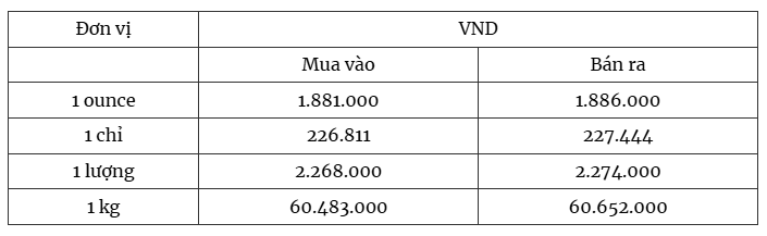 Giá bạc thế giới giảm, hiện ở mức giá 1.881.000 đồng/ounce (mua vào) và 1.886.000 đồng/ounce (bán ra).