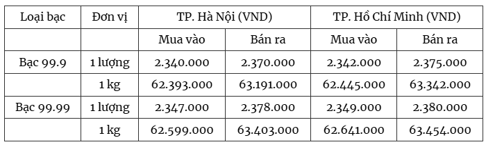 Tại Tập đoàn Vàng bạc Đá quý Phú Quý, giá bạc đang niêm yết ở mức 2.669.000 đồng/lượng (mua vào) và 2.752.000 đồng/lượng (bán ra) tại Hà Nội. Ngoài ra, theo khảo sát tại các địa điểm giao dịch khác ở Hà Nội, giá bạc trong nước đã giảm, hiện được niêm yết ở mức 2.340.000 đồng/lượng (mua vào) và 2.370.000 đồng/lượng (bán ra).