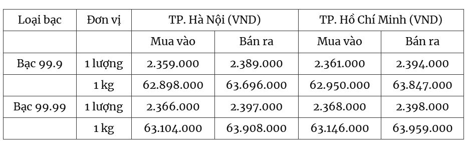 Tại TP. Hồ Chí Minh giá bạc hiện ở mức 2.361.000 đồng/lượng (mua vào) và 2.394.000 đồng/lượng (bán ra).