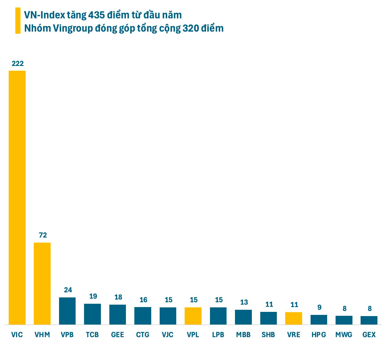 Với cú bứt phá ngoạn mục, riêng cổ phiếu VIC đã đóng góp 222 điểm vào VN-Index từ đầu năm. Tính chung “bộ tứ siêu đẳng” của tỷ phú Phạm Nhật Vượng (VIC, VHM, VPL, VRE), mức đóng góp vào chỉ số lên đến 320 điểm. Đáng chú ý, VN-Index chỉ tăng 435 điểm trong khoảng thời gian này.