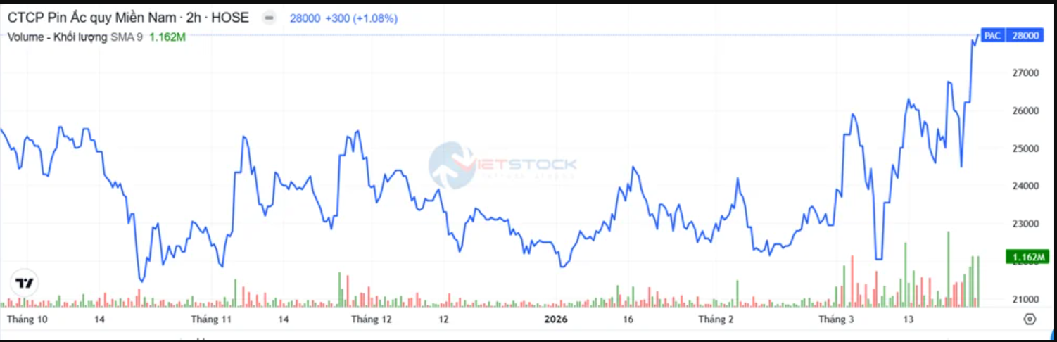Bất chấp diễn biến này, cổ phiếu PAC của CTCP Pin Ắc quy Miền Nam – Pinaco vẫn liên tục tăng giá từ đầu tháng 2 đến nay, chạy từ vùng 22.300 đồng/cp lên 28.000 đồng/cp. Riêng 2 phiên thị trường phục hồi, cổ phiếu này tăng trần.
